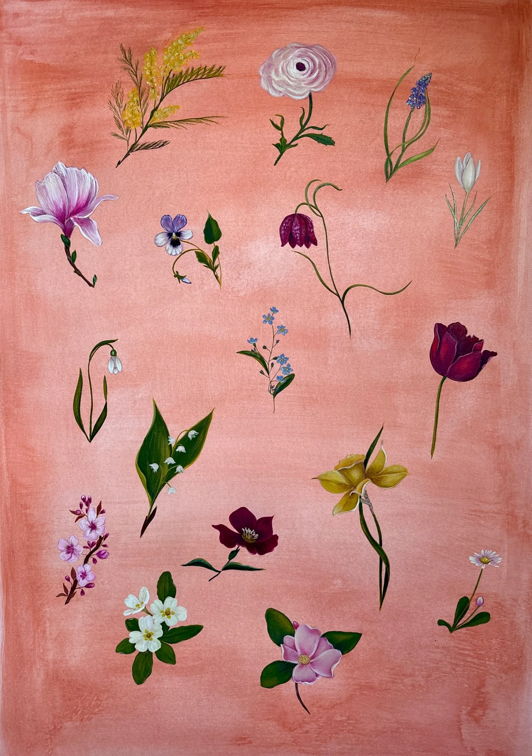 Delicate snowdrop, vibrant crocus and the first signs of spring, painted with precision and care in every detail, as if a fleeting moment of spring’s awakening had been captured forever. The soft, atmospheric background allows the flowers to stand out gently and lends the work a dreamlike depth. A tribute to the quiet power of early spring, when life awakens quietly but inexorably.